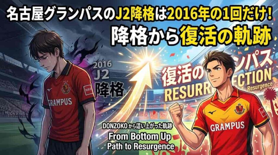 まず最大の疑問に答えます。名古屋グランパスのJ2降格は、クラブ史上2016年の1回のみです。Jリーグが1993年に創設されてから2部制が導入された1999年以降、グランパスは長い間J1にとどまり続けてきた「不降格クラブ」でした。