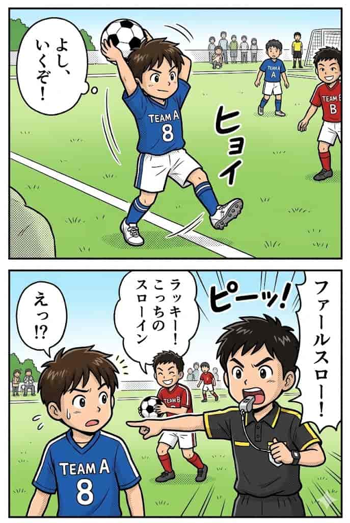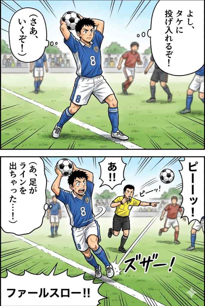 スローインのルールに違反した場合は「ファウルスロー」となり、同じ場所から相手チームのスローインで試合が再開されます。フリーキックやペナルティキックになるわけではなく、スローインが相手に移るだけです。