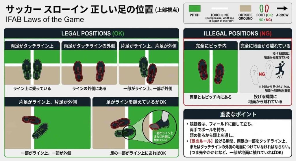 サッカーのスローインにおける足のルールを改めて整理すると、以下のようになります。