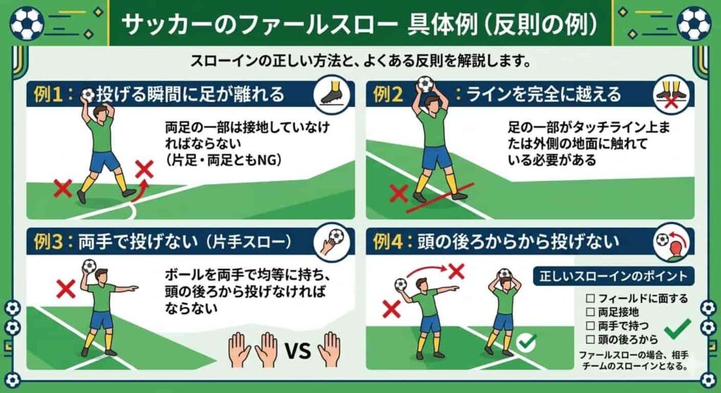 スローインの反則(ファウルスロー)は、足の位置以外にもさまざまな種類があります。試合中に見落としがちなNG例を一覧で確認しておきましょう。