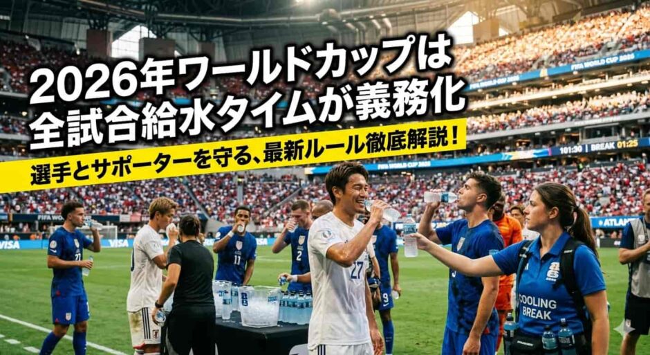 - 2026年北中米大会から全試合で前後半22分頃に3分間の給水タイムを義務化(FIFA公式発表・2025年12月)