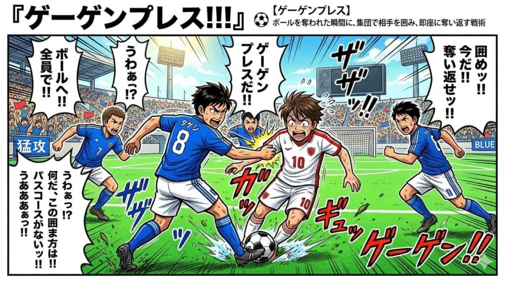 複数の選手が連動して一気にプレッシャーをかけることで、相手は選択肢を持てないまま追い詰められます。この「混乱の瞬間」を戦術として体系化したところに、ゲーゲンプレスの知的な巧みさがあります。