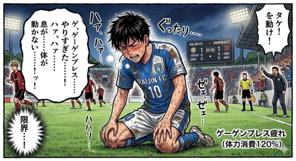 ゲーゲンプレスは90分間を通じて全選手が高強度の走力とプレッシャーを維持し続けることを前提としています。そのため、試合を通じた体力消耗が非常に激しいという根本的なリスクがあります。前半に激しくプレスをかけた結果、後半に足が止まった瞬間、ゲーゲンプレスは逆に守備の穴を生む原因になります。体力管理とローテーションの活用は、この戦術を採用するうえで欠かせない要素です。
