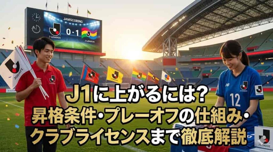 「J1に上がるにはどうすればいいの?」「プレーオフって何?引き分けでも昇格できるって本当?」「クラブライセンスって何で持ってないチームがあるの?」——Jリーグを観戦していると、昇格・降格の仕組みが気になることがあります。J2からJ1に昇格する条件はシンプルなようで、実は知れば知るほど奥が深い制度です。この記事ではJ1に上がるための条件・昇格プレーオフの仕組み・引き分けのルール・J1クラブライセンスの基準まで、初心者からコアなサッカーファンまで満足できるよう徹底解説します。
