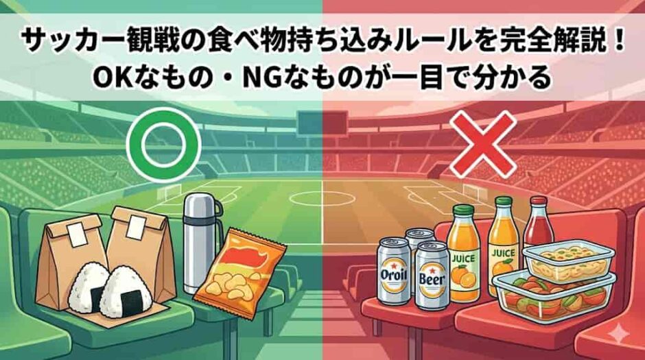 「スタジアムにお弁当を持ち込んでいいの?」「ペットボトルは持ち込める?」「食べ物の持ち込みがNGだったらどうすればいい?」——サッカー観戦前に「持ち込み食べ物」について調べる方は非常に多いです。この記事では、スタジアムへの食べ物・飲み物の持ち込みルール、持ち込みOKなものとNGなもの、持ち込みが制限される理由、節約しながらスタジアムグルメを楽しむコツまで、サッカー観戦前に知っておきたいすべてを徹底解説します。