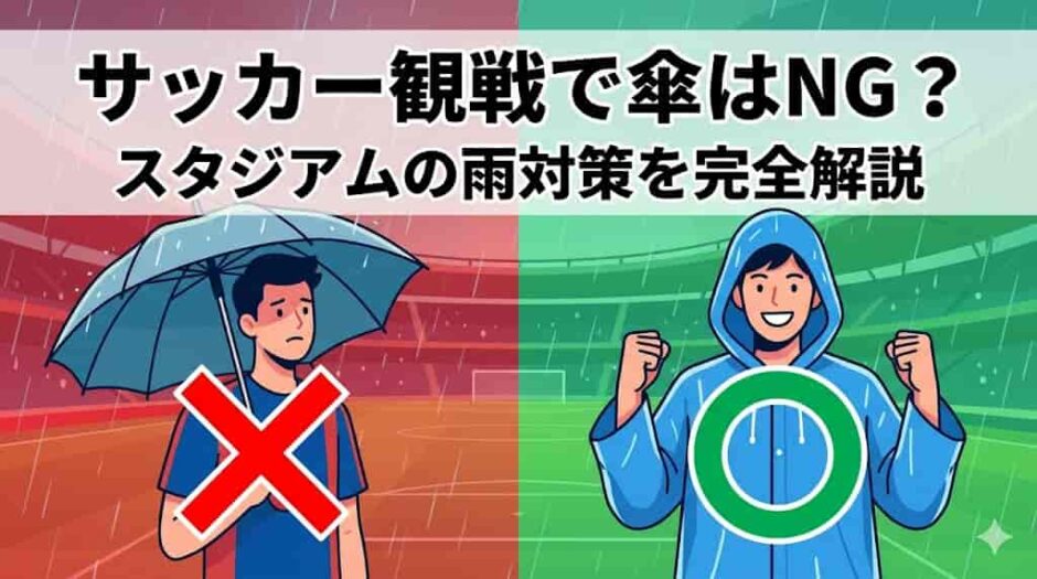 「試合当日に雨予報が出ているけど、傘を持って行っていいの?」「スタジアムって傘を使ってもいいのか、ルールがよくわからない」——サッカー観戦に行く予定で天気が不安な方からよく聞かれる疑問です。この記事では、スタジアムでの傘のルール・持ち込み可否・雨の日のベストな対策まで、スタジアムの雨事情を徹底解説します。「雨でも快適に観戦するための完全ガイド」として、おすすめレイングッズの選び方まで網羅しました。