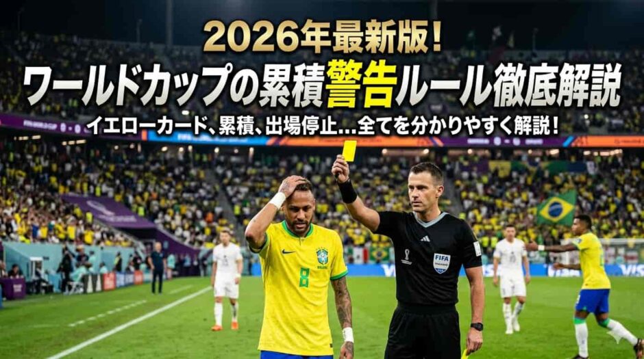 ワールドカップの累積警告ルールはJリーグとも、チャンピオンズリーグとも異なる独特の仕組みです。「何枚で出場停止か」だけでなく、「いつリセットされるか」「フェアプレーポイントとどう連動しているか」「予選の警告は本大会に持ち越されるか」——これらをセットで理解しておかないと、試合観戦で大切な場面を見逃してしまいます。この記事では、ワールドカップの累積警告ルールを完全網羅し、日本代表に関わった具体的な事例や2026年大会への影響まで徹底解説します。