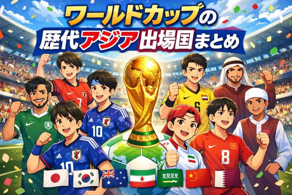 この記事では、ワールドカップ アジア出場国 歴代の全記録を大会ごとに整理し、出場枠の推移、各国の通算成績、そして2026年大会の最新情報まで網羅的にまとめています。「あの大会にはどの国が出ていたっけ?」「アジアの出場枠はどう変わってきたの?」といった疑問をすべて解消できる内容です。