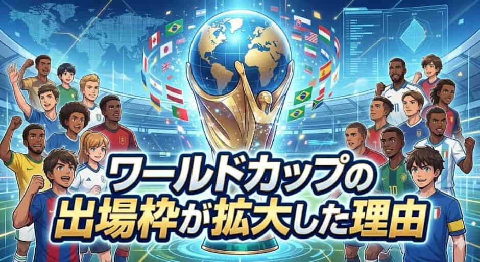 2026年北中米ワールドカップから、本大会の出場枠が32カ国から48カ国へと大幅に拡大されます。「なぜそんなに増やすの?」「サッカーのレベルは下がらないの?」「日本にはどんな影響がある?」——そんな疑問を持つサッカーファンや一般の方は多いはずです。